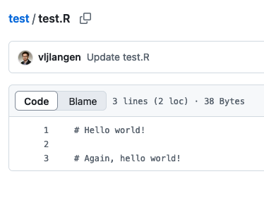 Nyt tiedosto test.R näkyy Käyttäjä 2:n päivittämässä muodossa GitHubissa:
