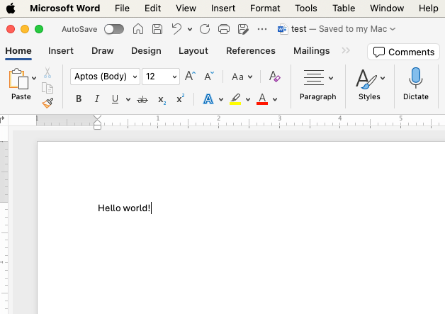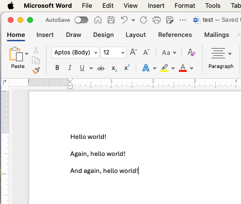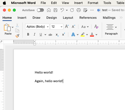 Kaikki käyttäjät aloittavat tilanteesta, jossa test.docx on commit-tilassa C0 ja näyttää seuraavalta: