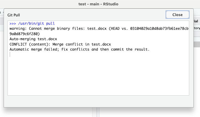 Vaikka Käyttäjä 2 antaisi komennon git config pull.rebase false ja yrittäisi sen jälkeen pull-toimintoa, Git ei voisi yhdistää kahta eri versiota test.docx-tiedostosta, koska kyseessä on binaarinen tiedosto.