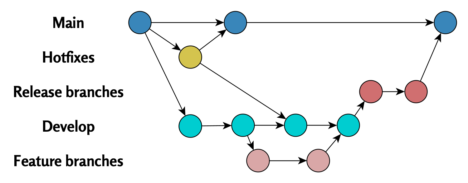 maintaimaster), joka sisältää tuotantoversion. - Useita muita haaroja, joissa yksittäiset ominaisuudet kehitetään ja testataan erikseen.